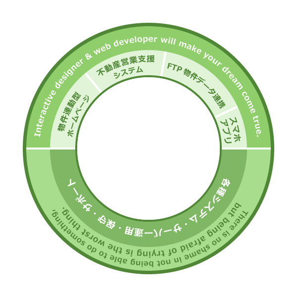 1. 不動産業界に特化したシステム開発・保守・運用 2. 不動産専門ポータルサイトの企画・開発・メディア運営 3. AI・VR等の先端技術を活用した不動産実務支援ソリューションの提供 4. スマートフォン向けアプリケーションの開発 5. テクノロジーとデザインを融合させたWebプラットフォームの構築 |